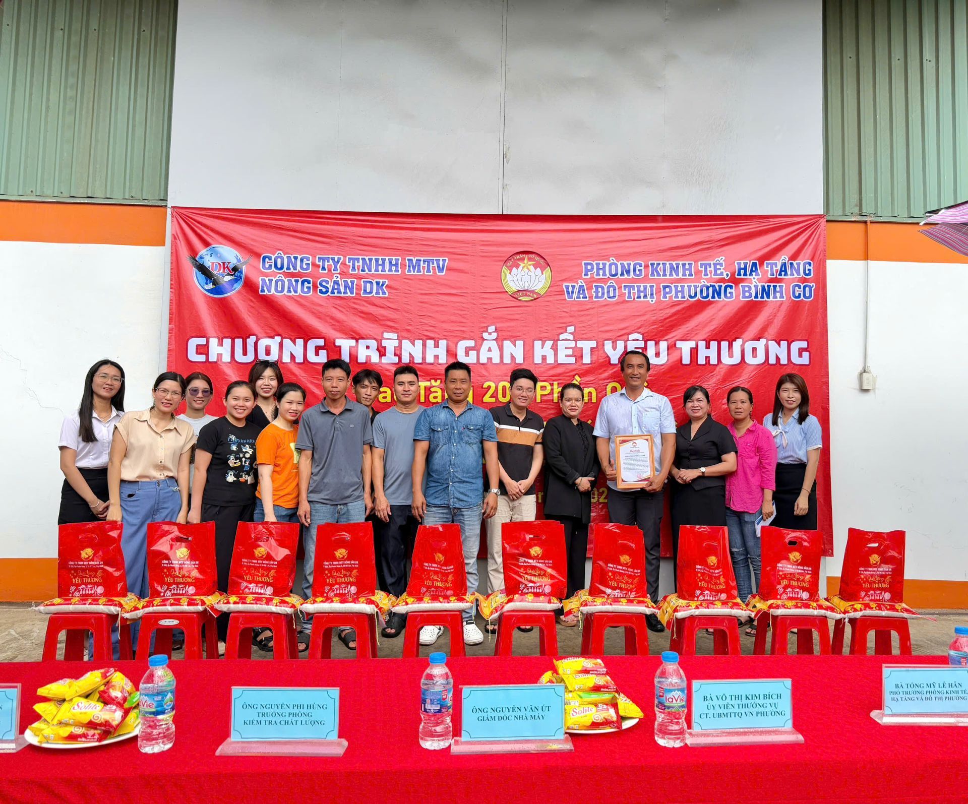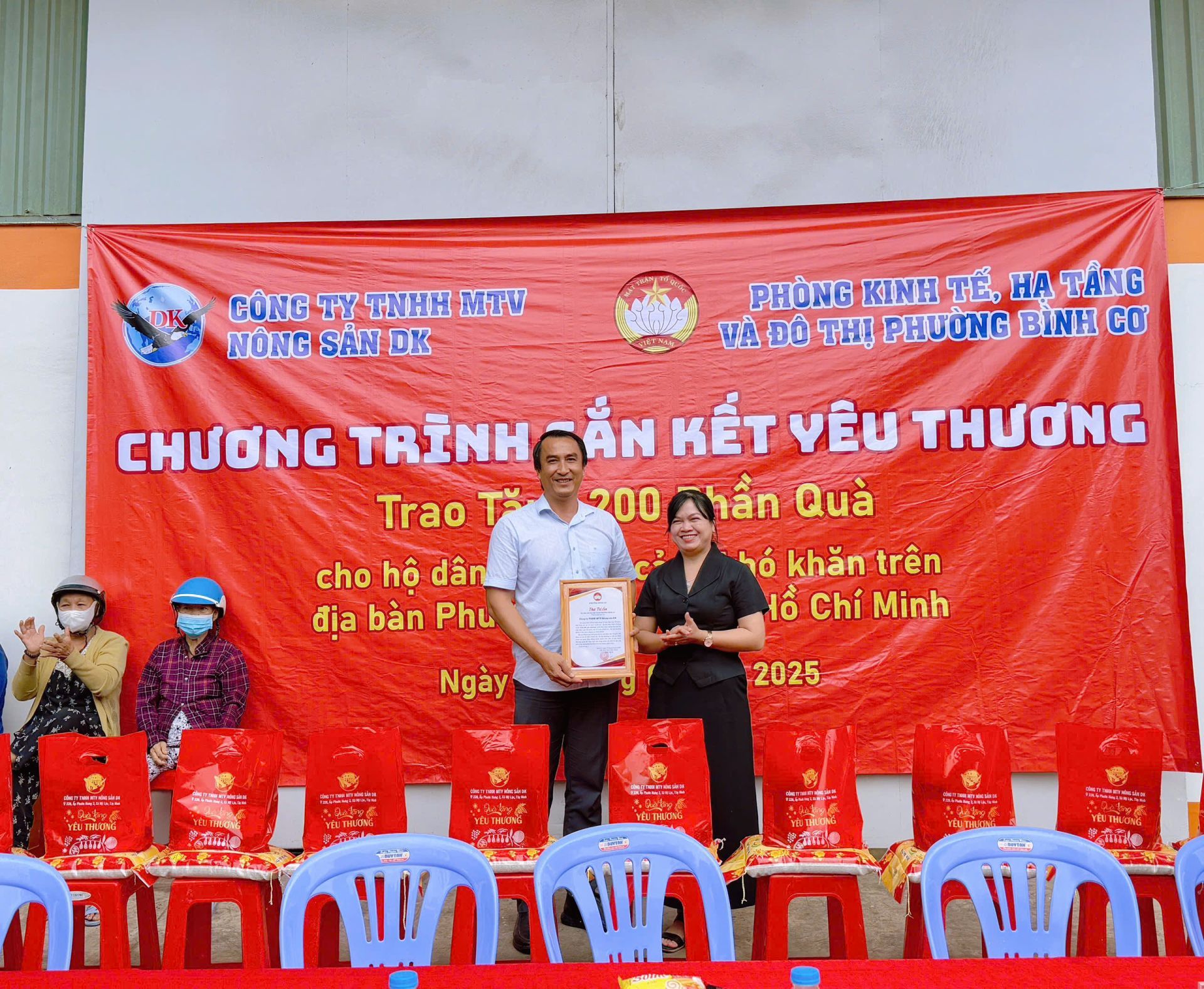 Tham dự chương trình có bà Võ Thị Kim Bích – UVTV, Chủ tịch UBMTTQ Việt Nam phường; bà Tống Mỹ Lê Hân – Phó Trưởng phòng Kinh tế, Hạ tầng và Đô thị phường; ông Nguyễn Phi Hùng - Trưởng phòng kiểm tra chất lượng; bà Phạm Băng Tuyền – Trưởng phòng đảm bảo chất lượng đại diện Công ty TNHH MTV Nông sản DK và 200 hộ có hoàn cảnh khó khăn trên địa bàn phường Bình Cơ.